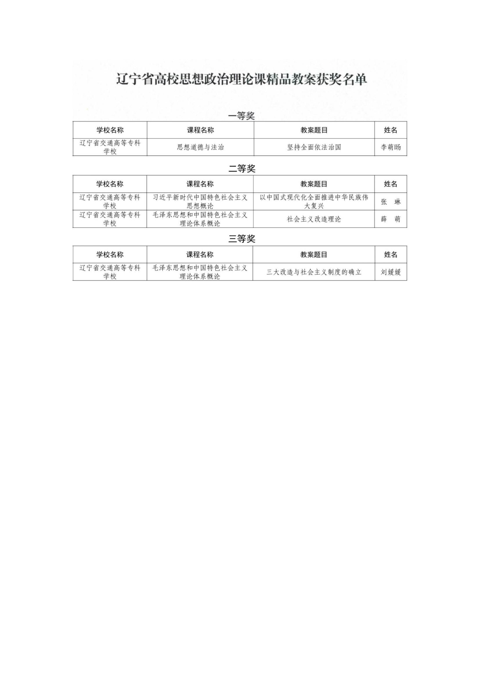此次大赛是“2024年度辽宁省高校思想政治理论课创优计划”系列活动之一,是面向全省高校思想政治理论课教师的赛事活动。我校马克思主义学院积极组织教师备赛、精心打磨,在激烈竞争中取得优异成绩。李萌旸老师的教案《坚持全面依法治国》荣获一等奖,张琳老师的教案《以中国式现代化全面推进中华民族伟大复兴》、薛萌老师的教案《社会主义改造理论》分别荣获二等奖,刘媛媛老师的教案《三大改造与社会主义制度的确立》荣获三等奖。