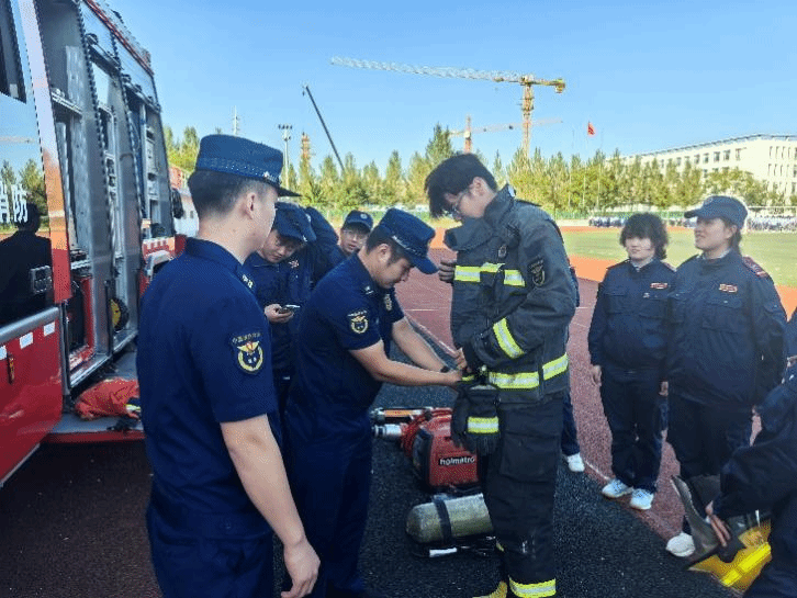 随后,各系学生代表在消防队员的带领下参观了消防救援车,了解掌握各类专业救援设备的名称、用途和操作方法,近距离接触了平时难得一见的“消防神器”,并在消防员指导下试穿了防护服、消防自救呼吸器等消防装备,亲身体验了一次当消防员的感觉,加深了对消防工作的理解和认识。