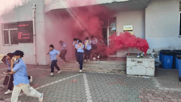 最后进行的是全员疏散演练。消防救援车拉响警报,各公寓门前同时点燃烟雾弹,模拟火灾现场。在宿舍管理员指引下,同学们用湿毛巾捂住口鼻,低姿快速通过烟雾弥漫的楼道,从最近的安全出口有序疏散至指定安全区域,到达集合点后,各班级迅速清点人数并向指挥中心报告。