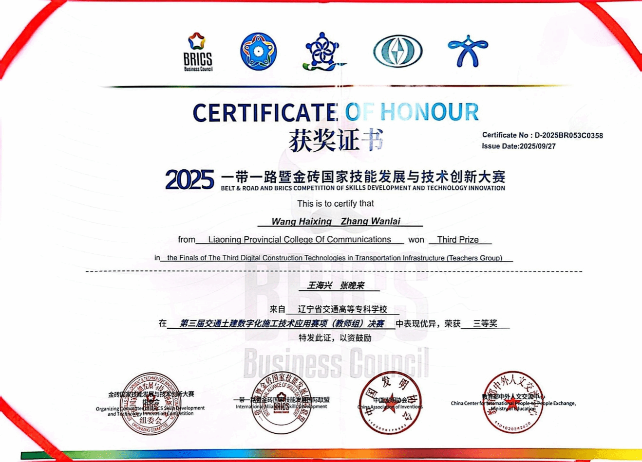 2025925日至27日,2025“一带一路”暨金砖国家技能发展与技术创新大赛之第三届交通土建数字化施工技术应用赛项决赛在哈尔滨铁道职业技术学院隆重召开。作为经金砖国家工商理事会批准、外交部备案的国际赛事核心赛项,本次决赛规模盛大、覆盖面广,吸引了来自全国30个省级行政区的141所院校参与,共253支学生队伍与28支教师队伍参与总决赛。本次竞赛,我校公路与铁道工程系李琛琛和于珂卿两名同学,在于可鑫和曹英浩两位教师的悉心指导下,获得了本次大赛的国赛学生组“三等奖”;我校公路与铁道工程系王海兴和张晚来两位老师获得了国赛教师组“三等奖”。