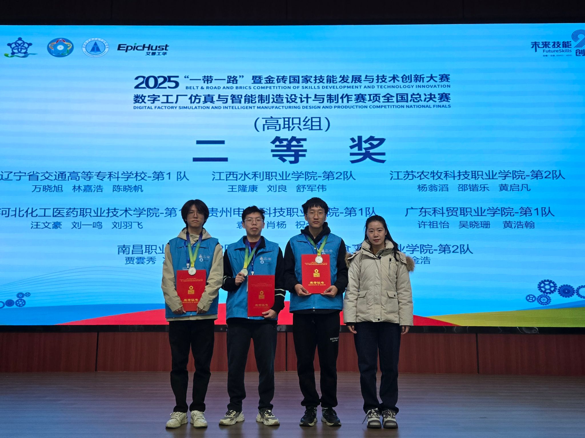 本次获奖团队由高洪波、杨嘉瑶两位教师指导,由机电一体化技术专业林嘉浩、万晓旭、陈晓帆三位同学组成。参赛团队在比赛中应用数字工厂仿真软件设计并仿真生产流程,优化工厂布局,集成自动化设备,并利用MES软件进行数据分析、生产调度和质量控制,突出智能制造系统的设计与优化。