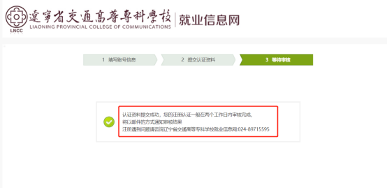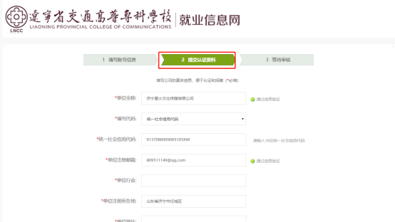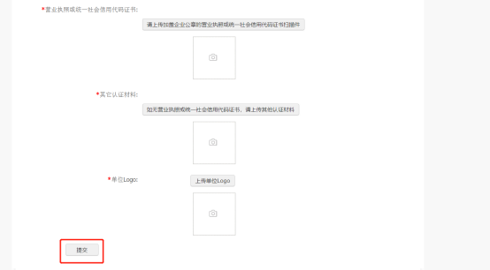 3.然后填写认证材料信息、上传认证材料后点击“提交按钮”即可提交给学校老师进行审核。审核通过后会有邮件提醒,然后就可以进行招聘会的报名。