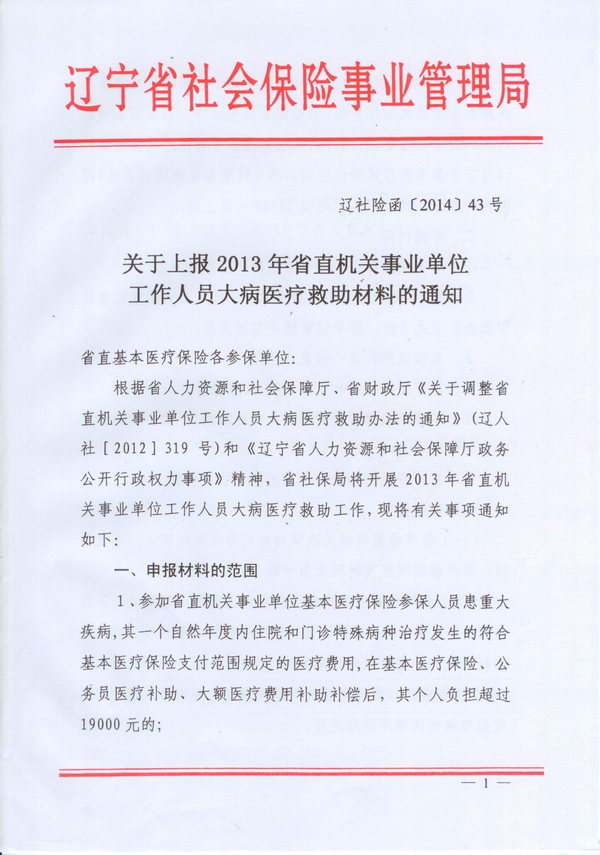 根据省人力资源和社会保障厅、省财政厅《关于调整省直机关事业单位工作人员大病医疗救助办法的通知》(辽人社【2012】319号)和《辽宁省人力资源和社会保障厅政务公开行政权力事项》精神,省社保局将开展2013年省直机关事业单位工作人员大病医疗救助工作。具体申报范围、申报材料和相关要求详见文件,相关人员于6月23日前将申报材料送交人力资源处。