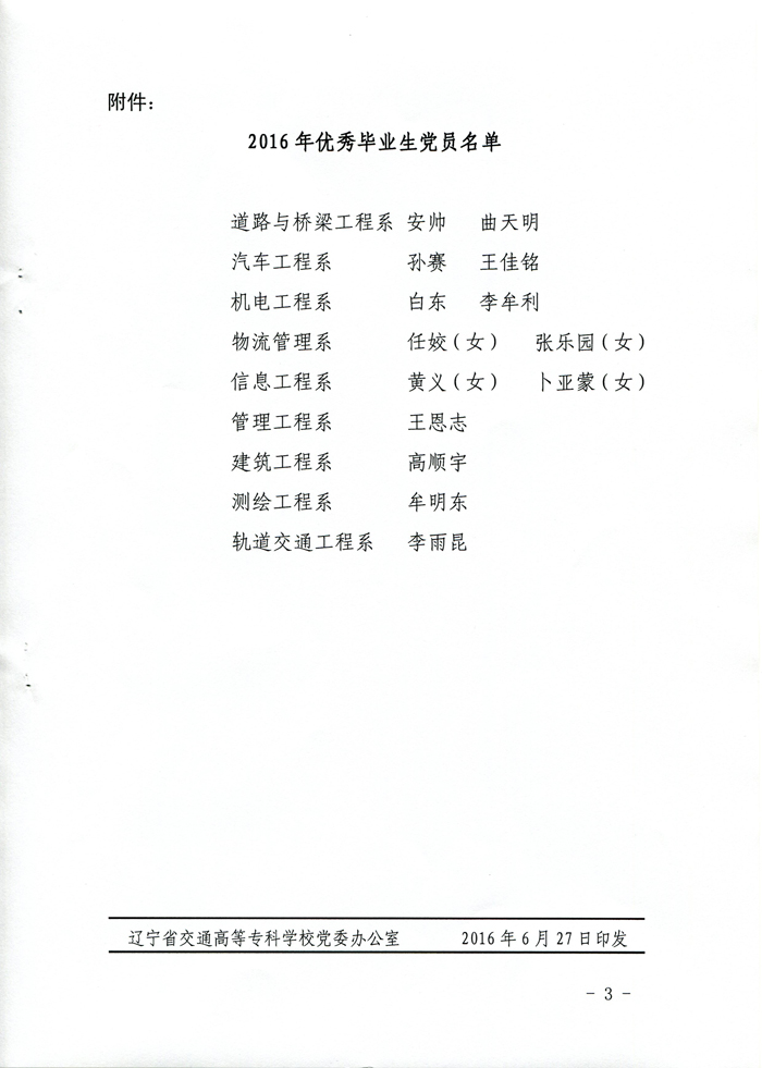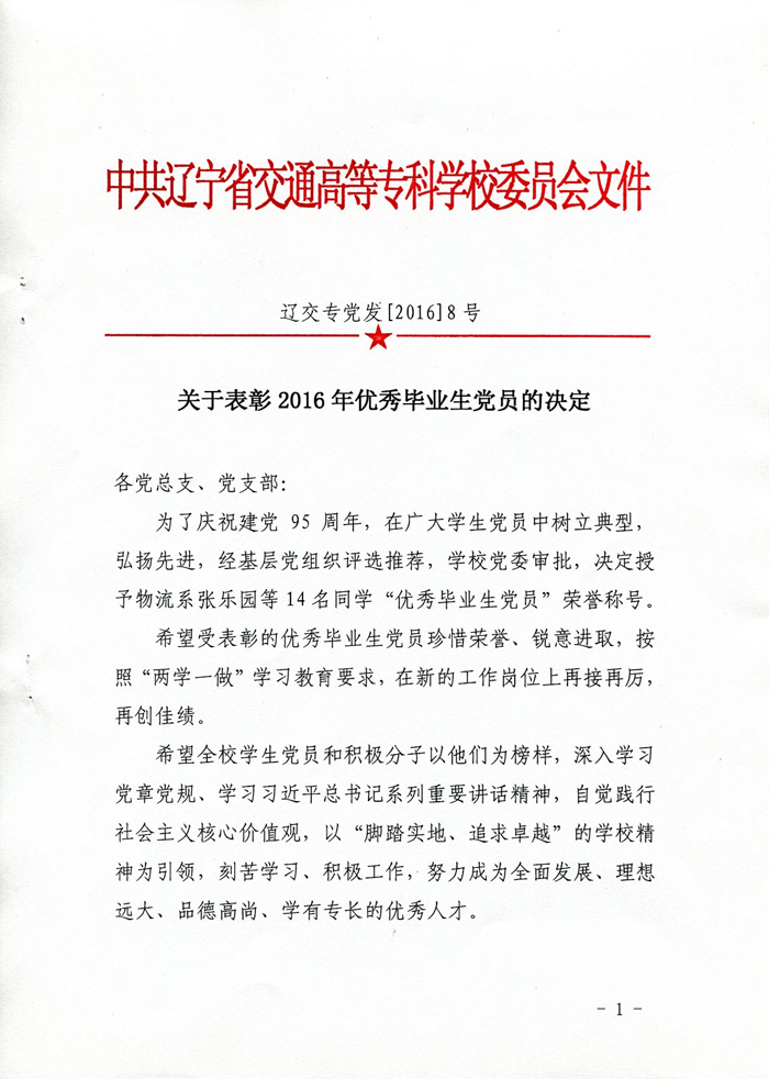关于表彰2016年优秀毕业生党员的决定