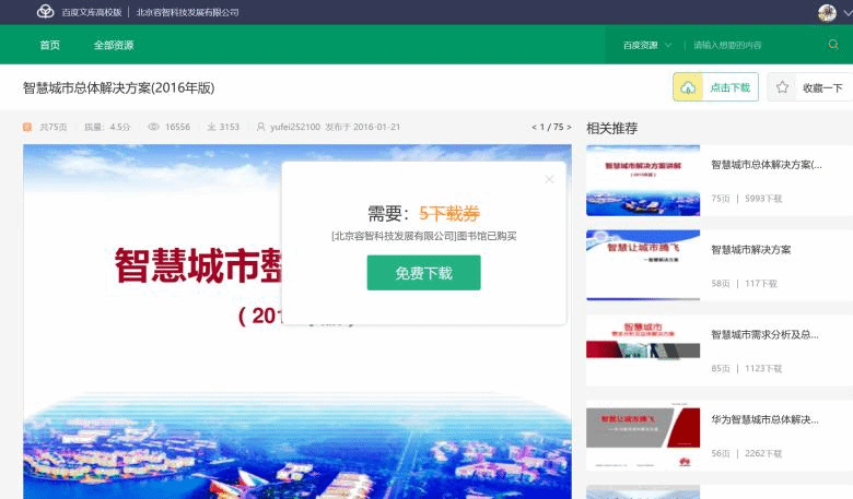 5.绑定成功后,校外在百度文库高校版(https://eduai.baidu.com)登录已经认证过的个人账号,选中要下载文档,点击“点击下载”,出现“XXXX图书馆已购买”进行免劵下载使用。