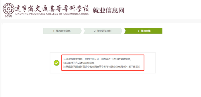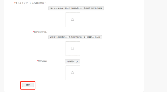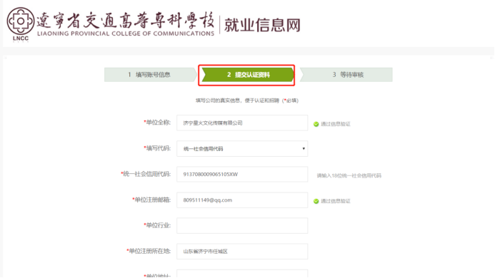 3.然后填写认证材料信息、上传认证材料后点击“提交按钮”即可提交给学校老师进行审核。审核通过后会有邮件提醒,然后就可以进行招聘会的报名。