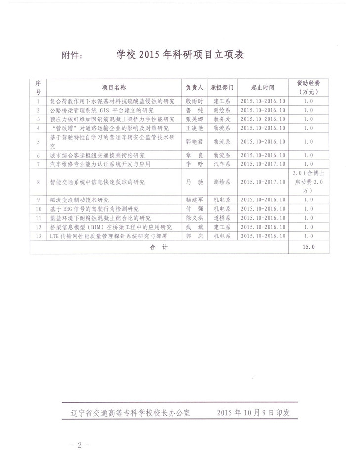 学校已发布《关于批准2015年校级科研项目的通知》(辽交专技发〔2015〕78号),请项目负责人认真编写项目计划任务书,校级科研项目计划任务书在“科技处网站—资料下载”中下载,于10月16日前将填好的项目计划任务书电子文档以“校级科研计划任务书+姓名”发送到邮箱:lncckjc@163.com。请各项目组从即日起按计划积极开展研究工作,确保高质量完成研究任务。