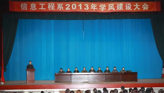3月18日中午,信息工程系在礼堂召开2013年学风建设大会,2011、2012级全体学生参加大会,系领导、专业主任、全体专兼职辅导员出席大会,会议由学工办主任李闯主持。教学办主任郗大海宣读了信息工程系晚自习管理制度和信息工程工程系学风建设实施方案,党总支李大勇书记宣读了2012学年获得专业状元、学习标兵荣誉称号以及2012-2013学年第一学期获得学习成绩综合评比奖学金学生名单,与会领导向获奖同学颁发了证书和奖品。获奖学生代表11432班史宇冬同学代表发言,总结自身已经度过的近两年的大学生活,他向全体同学提出倡议:珍惜现在所拥有的,充分利用学校图书馆、实训室等教学学习资源,好好学习,充实自己。顺利完成大学学习任务,为自己美好的未来奠定下坚实的基础!最后信息工程系赵红岩主任总结讲话,他号召获奖的优秀学生今后要更加努力,在各项工作中起到模范带头作用,全系学生以他们为榜样,树立学习目标,养成良好的学习、生活习惯,积极参加各类活动,提升个人的专业技能让自己走出校门后能够适应社会,适应自身的工作岗位。