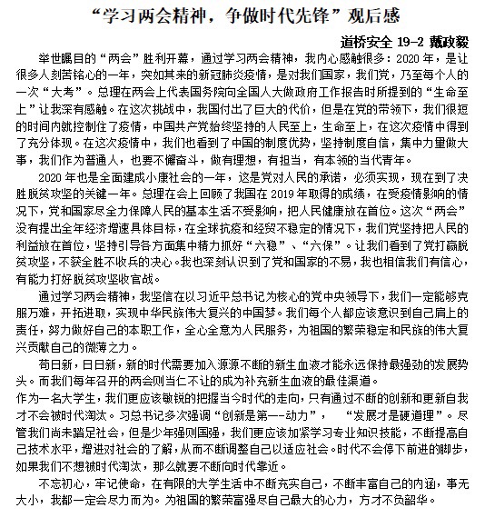 通过新媒体及各专业群内广泛推广和宣传,同学们十分重视此次学习活动,利用广播、电视、网络等多种渠道和形式积极收听收看大会直播。同学们就特殊时期召开的全国“两会”认真收看、学习和总结,撰写个人学习心得体会,并表示新时代青年要坚定理想信念、培养爱国情怀、勇于担当责任、磨砺意志品质、练就过硬本领、锤炼品德修为,肩负起这一特殊时期的历史使命,共克时艰、赢得未来。