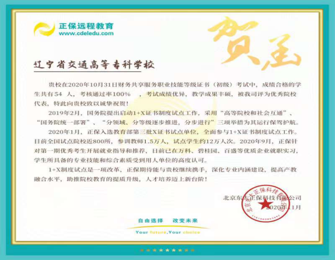 2020年4月,经过教务处组织,系里申报,我校财务共享服务职业技能等级考试考点获批,系班子高度重视“1+X”证书认证考试工作,高效率部署师资培训工作,经过培训考试,4名教师取得培训讲师资格证书,1名教师获得种子师资资格证书。经过一个多月严格系统地培训,2020年10月31日,54名19级会计专业学生报名并全部通过财务共享服务职业技能等级考试。本次考试全国通过率为79.6%,我校会计专业通过率为100%,取得了优异的成绩并获得职业教育培训评价组织贺函。