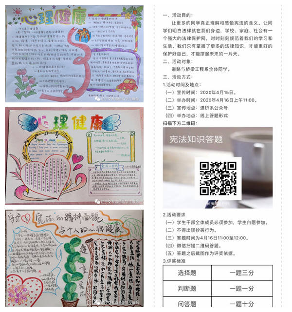 道桥系通过公众号、qq群等形式进行宪法学习宣传教育,普及宪法知识,使法制观念深入学生内心,充分认识和感受宪法根本法的地位,在全系学生中营造了良好的活动气氛,调动学生们学习法律的积极性;为检验同学们通过前期公众号平台对宪法知识的掌握情况,道桥系举办了“学宪法,讲宪法”知识答题活动,进一步加深了同学们对有关宪法知识的了解,掀起了学习宪法、遵守宪法、维护宪法的热潮;“健康心灵、与法同行”手抄报活动的举办,对加强学生自我教育,提高法律知识,增进心理健康,引导学生树立正确的人生观、世界观和价值观起到了积极的推动作用。