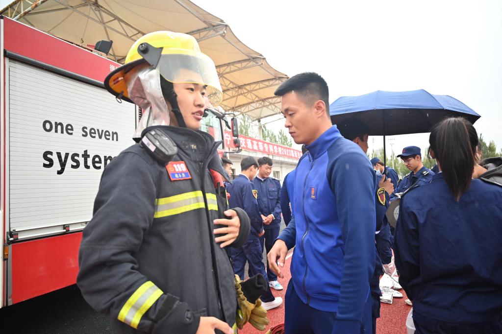 在实践教学和互动问答环节,学生代表在消防员指导下亲身感受操作常见消防水带、破拆工具、防护服、消防自救呼吸器等的使用方法,掌握实践技能。
