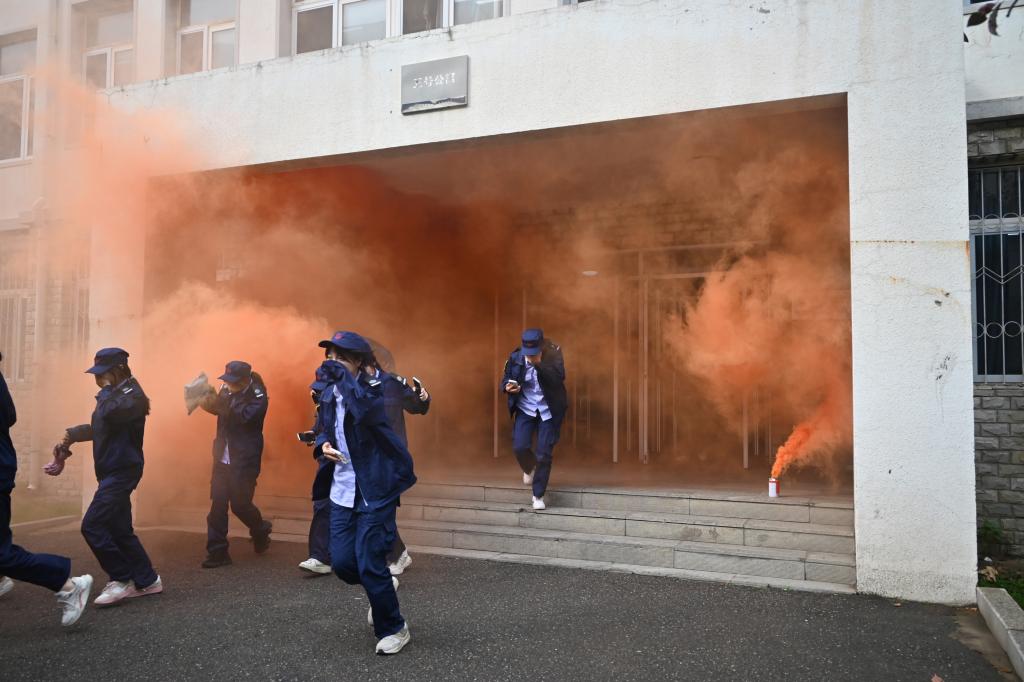 在应急疏散环节,以各学生公寓为“模拟火场”现场,1430分消防车警报响起,全体新生进行了应急疏散逃生演练,学生们用湿毛巾紧捂口鼻、弯腰俯身、穿越浓烟区域,在工作人员引导下安全有序撤离至室外预定地点。