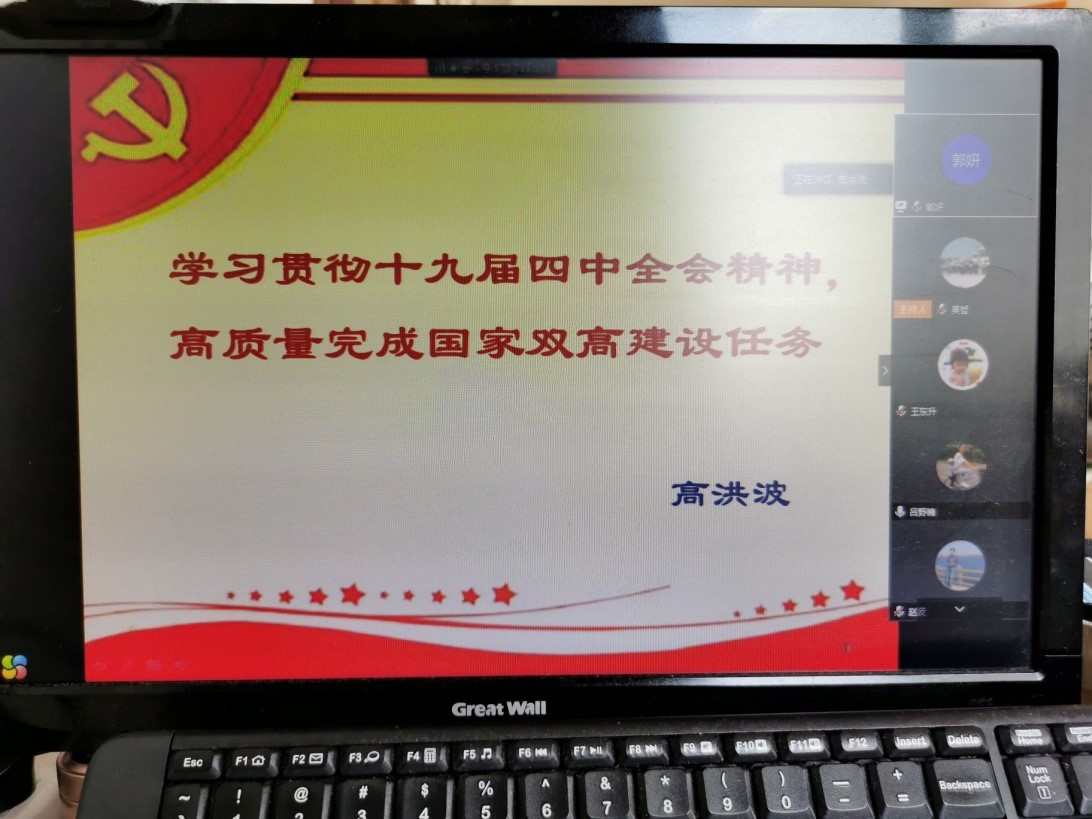 首先,赵波书记带领全体党员通过线上线下同步的方式,重温入党誓词。铿锵有力的宣誓声让所有党员再次接受入党洗礼,深受感染、备受教育。然后,在这个特殊的日子里,一起为许光君等九位同志过政治生日,通过讲述个人入党经历、入党动机等方式,牢记共产党员的初心和使命,实现了“几名党员过生日,全体党员受教育”。接着,赵波书记传达了2020年学校全面从严治党工作会议精神,并结合学校印发的《KYTY.COM开云体育(中国)科技公司2020年党建及思想政治工作要点》,向全体党员进行了内容解读和工作部署。最后,开展了题为“学习贯彻十九届四中全会精神,高质量完成国家双高建设任务”的学习研讨活动。党总支宣传委员高洪波结合自身培训体会,带领全体党员再次学习了十九届四中全会精神和张亚军书记在学校中层干部集中培训上的总结讲话精神,并且围绕加强制度建设,推动学校国家“双高”建设,提升学校治理体系和治理能力现代化,联系个人思想工作实际进行了中心发言,吕野楠等6位同志参与了研讨。