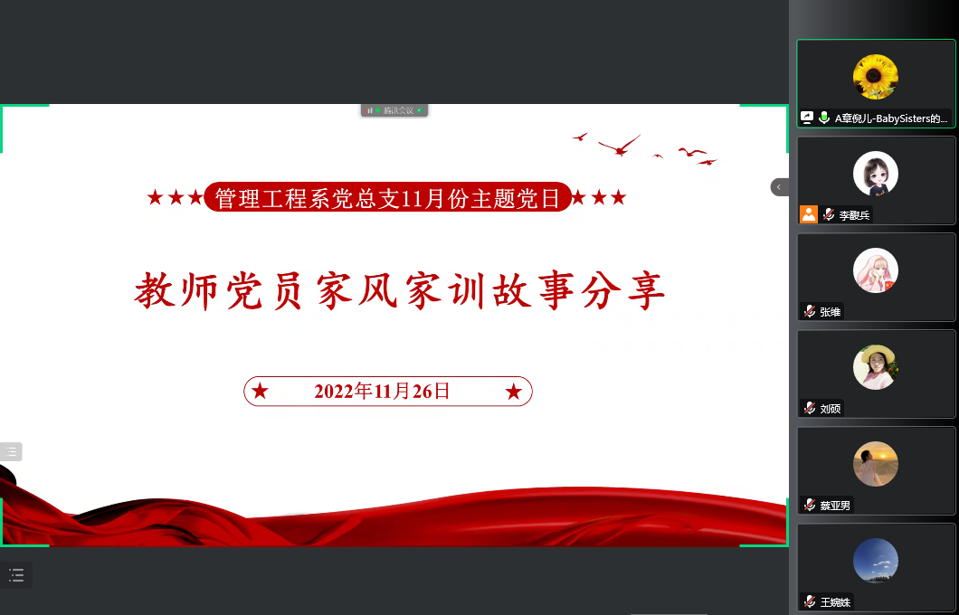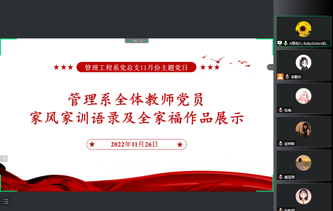 2022年11月26日,管理工程系党总支以线上的方式组织开展了以弘扬良好家风家训为主题的11月份主题党日。管理工程系教工党员和学生党员参加了会议,会议由党总支副书记张宁主持。
