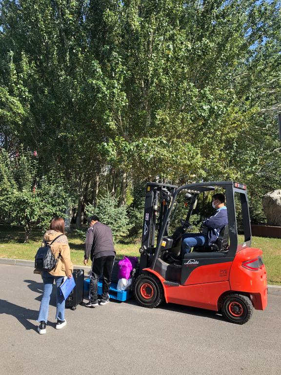 2021年9月12日是我校省外学生的返校日,也是省外新生的报到日。由于是首批学生返校,一切组织和接待工作都需要由教职工来完成。根据疫情防控的需要,返校和报到学生不能由家长陪同入校,而新生的行李又比较多。在人手紧、新生需要帮助的情况下,物流管理系党员同志充分发挥先锋模范作用,以“哪里需要我,我就在哪里”的崇高觉悟,践行共产党员的责任与担当。同志们相互配合、各司其职,有到火车站、飞机场接站接机的,有学校大门口核查测温的,有接待处办理手续的,有位置引导并帮助运送行李的。在服务学生的过程中,充分发挥物流管理系优势,利用叉车、平板车帮助学生搬运大件行李了校园内一道既亮丽又别样的风景。