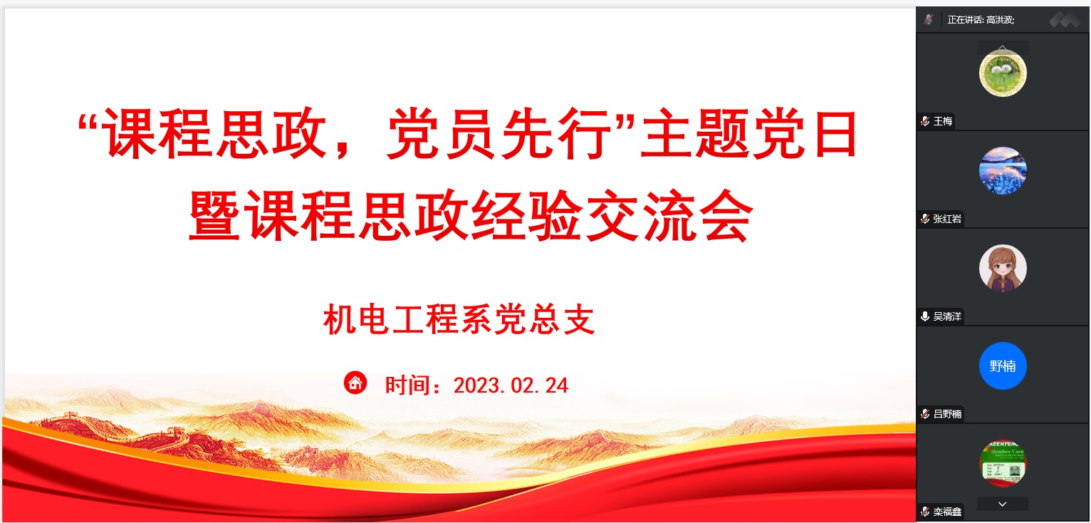 为加强课程思政建设,充分发挥课程育人作用,2月24日机电工程系党总支线上开展了“课程思政,党员先行”主题党日暨课程思政经验交流会。活动由系党总支书记高洪波主持,全体党员参加了本次活动。