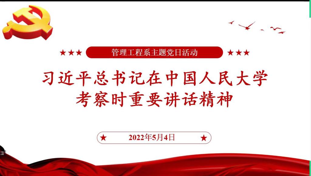 2022年5月4日,管理工程系党总支以腾讯会议形式组织开展了5月份主题党日活动,学习习近平总书记在中国人民大学考察时重要讲话精神。管理工程系全体教工党员和学生预备党员参加了会议,会议由系党总支书记王富饶和教工党支部书记孙莹主持。