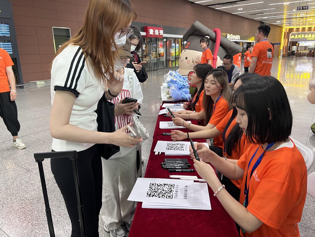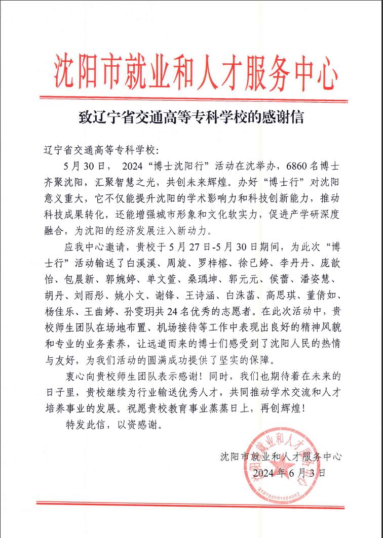 在活动期间,会展策划与管理专业的学生们忙碌的身影随处可见。他们承担起了活动现场布置、流程引导、后勤保障等多项重要任务。在沈阳桃仙国际机场,他们身着统一的志愿者服装,手持鲜花和欢迎牌,在机场大厅形成了一道亮丽的风景线,他们为远道而来的博士们提供了周到的接待服务,帮助他们搬运行李,引导博士们签到,并为博士们答疑解惑,他们以热情的工作态度迎接每一位博士的到来,让博士们在抵达沈阳的第一时间就感受到了温暖和关怀。在活动现场,志愿者们更是发挥了重要作用。他们精心布置了活动场地,发挥其专业优势,精心设计细节,力求营造出最佳的活动氛围。会展策划与管理专业学生的表现得到了组织方的高度肯定,沈阳市就业和人才服务中心特发来感谢信,感谢信全文如图。