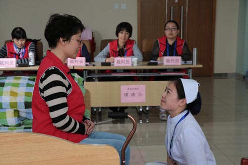由全国民政行指委、民政部职业技能鉴定指导中心主办的“第七届全国职业院校民政职业技能大赛”养老护理员决赛日前在天津城市职业学院举行。来自全国21个省65所职业院校的158名选手参加了比赛。图为比赛场景。陈涛 摄