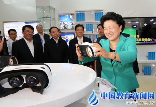 5月8日,在天津机电职业技术学院举行的2016年职业教育活动周启动仪式暨全国职业院校技能大赛开幕式结束后,国务院副总理刘延东考察了天津电视大学的展示活动现场,并亲自体验虚拟现实设备。中国教育报记者 樊世刚 摄