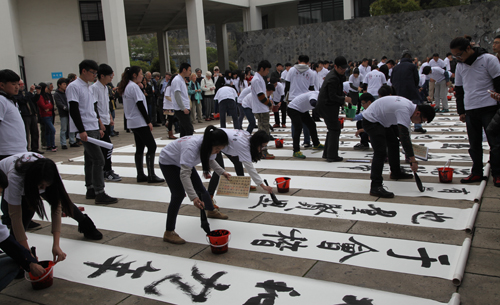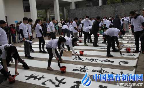 4月9日,绍兴文理学院兰亭书法艺术学院举行书法活动,学院师生、瑞士日内瓦书法研修团百余人共同泼墨挥毫,书写大字《兰亭序》。 谷江稳 摄