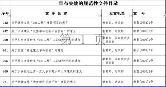 同时,在此次教育部宣布失效的文件中,还包括了“关于继续实施“优势学科创新平台”建设的意见”,“关于实施“特色重点学科项目”的意见”和“关于加快推进世界一流大学和高水平大学建设的意见”等一批文件。