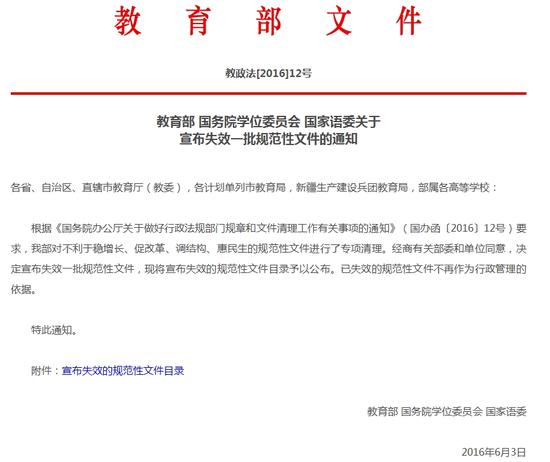 教育部在通知中表示,这些规范文件不利于稳增长、促改革、调结构、惠民生,已进行专项清理。已失效的规范性文件不再作为行政管理的依据。