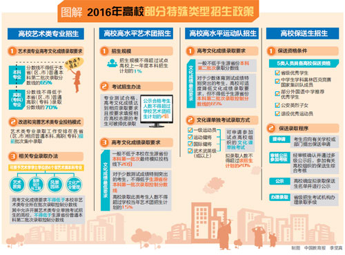 为进一步加强高校特殊类型招生工作管理,严格规范招生行为,促进考试招生工作公平公正,教育部办公厅近日下发《关于做好2016年普通高等学校部分特殊类型招生工作的通知》,针对当前个别高校存在的问题和薄弱环节,对高校艺术类专业、高水平艺术团、高水平运动队、保送生等4类特殊类型招生工作进一步扎紧制度笼子,细化、完善和重申了有关考试招生管理要求,明确政策红线,防止各行其是、降低标准、打擦边球。