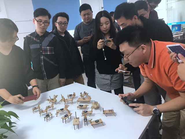 4月11日,走进北京师范大学附属实验中学的卡魅实验室,高云峰教授正在给来自来自香港、云南、广西、广州、浙江、湖北等地的中小学优秀校长及科技老师培训卡魅课程。
