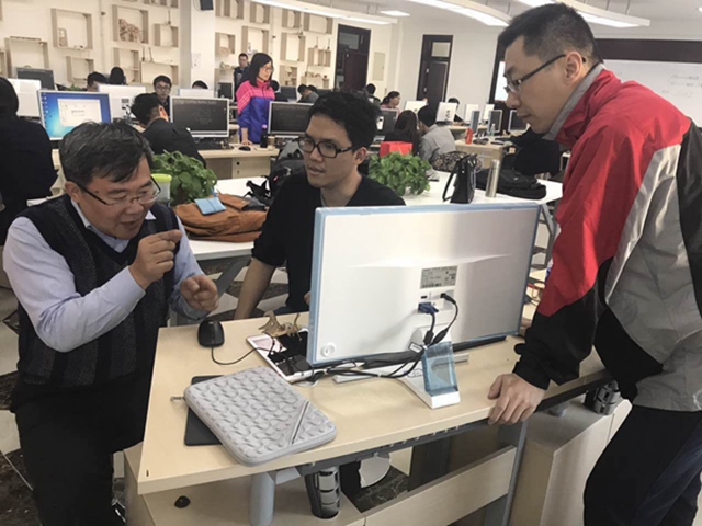 高云峰教授和香港青年协会李兆基书院周鸿强老师、广西南宁市逸夫小学陆俊达老师等探讨作品制作。