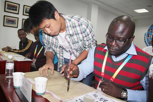 在落户于宁波职业技术学院的中国职业技术教育援外培训基地,非洲加纳共和国学员学习书写毛笔字。刘沪波 徐晓彤 摄