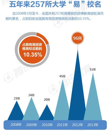 1999年,大学扩招后,高校花名册的变化一年比一年多。据不完全统计,近5年,全国有257所高校更名,很多专科学校要升格为“学院”,“学院”提升为“大学”。受中国科技大学、北京理工大学、上海财经大学等知名大学的影响,“科技”、“理工”、“财经”等字眼使用火爆。