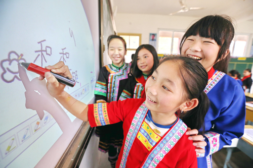2013年湖南省通道侗族自治县为15所农村中小学校的130余个班级配备了交互式电子白板,为提升农村教育教学质量创造了条件。图为该县坪坦乡中心小学学生在电子白板上感受现代化的教学手段。杨祖广 摄(资料图片)