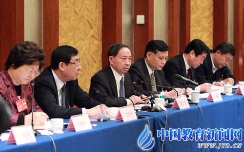 3月7日上午,教育部部长袁贵仁(左三)在全国政协十二届二次会议教育界别联组会上,虚心听取委员们对教育改革发展的意见和建议。记者 张学军 摄
