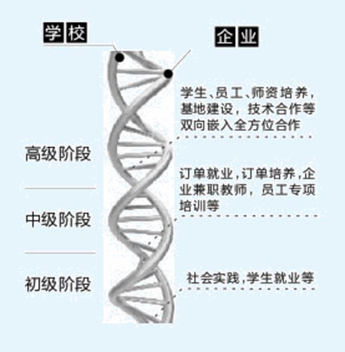 “双螺旋推进”校企双赢合作模式的主要特点是:由于定位不同,学校与企业是两条平行线,有其各自的独立性。校企合作根据合作紧密与深入程度可以分为3个层级,初级阶段主要是学生进行社会实践、顶岗实习,开展学生就业合作;中级阶段主要是双方进行订单班培养、订单就业、员工专项培训等合作;高级阶段主要是双方共同进行学生、员工、师资培养以及基地建设、技术合作等双向嵌入的全方位合作。随着校企合作的深入与紧密程度增加,初级阶段可以向高级阶段螺旋推进。 在校企合作的高级阶段,学校与企业虽然仍各自独立,但双方双向深层嵌入互动,你中有我、我中有你,相互促进、相互依存:学校学生是企业员工(就业、顶岗实习),企业员工是学校学员(定点培训);学校教师是企业技术、管理人员(现场挂职、企业双师工作站),企业技术、管理人员是学校教师(企业兼职教师、大师工作站);企业是学校实训与现场培训基地(校外实训基地),学校是企业技术服务、培训基地(技术服务合作、员工培训);企业为学校提供一流设备、技术人才(捐建、共建校内实训基地,企业人员指导实践教学),学校为企业提供高素质技能人才、技术服务。 |