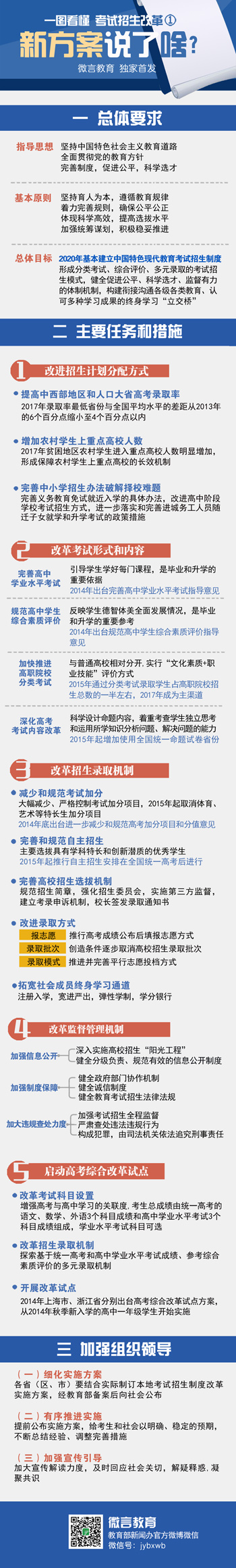 新华教育消息:改革开放30多年来,我国考试招生制度不断改进完善,初步形成了相对完整的考试招生体系。这一制度总体上符合国情,权威性、公平性社会认可,但也存在一些社会反映强烈的问题。9月4日,《国务院关于深化考试招生制度改革的实施意见》正式发布,就深化考试招生制度改革提出实施意见。