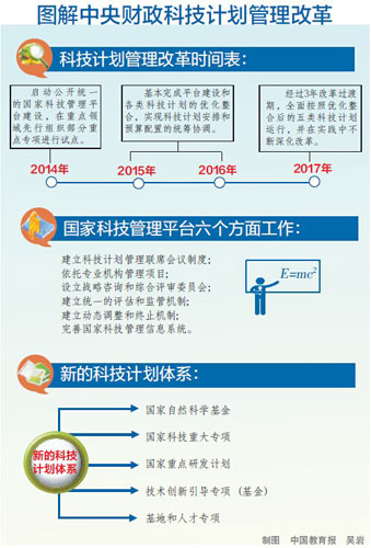 据了解,这次科技计划管理改革有确切的时间表:2014年就要启动公开统一的国家科技管理平台建设,在重点领域先行组织部分重点专项进行试点。2015至2016年,基本完成平台建设和各类科技计划的优化整合,实现科技计划安排和预算配置的统筹协调。2017年,经过3年的改革过渡期,全面按照优化整合后的五类科技计划运行,并在实践中不断深化改革。