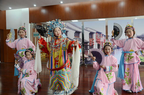 江苏省苏州市姑苏区山塘中心小学的小演员在排练京剧。(资料图片)
