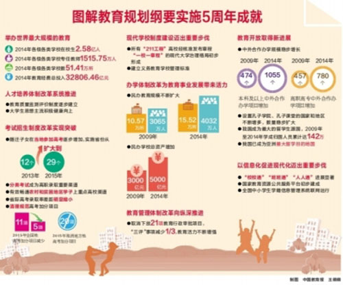 评估报告显示,2014年全国幼儿园总数比2009年增加7.2万所,教职工人数比2009年翻了一番。义务教育学校标准化建设全面推进,校际差距不断缩小。高中阶段教育机会明显增加,2014年初中毕业生升学率达95.1%,比2009年提高9.8个百分点;高中阶段毛入学率达86.5%,比2009年提高7.3个百分点。职业教育发展明显提速。高等教育区域结构进一步优化,新增设的377所普通高校,67.6%在中西部;专业学位硕士研究生教育学位类型由2010年的19个增加到2014年的40个,招生人数占研究生招生总数的比例从2009年的14.1%提高到2014年的43.5%。