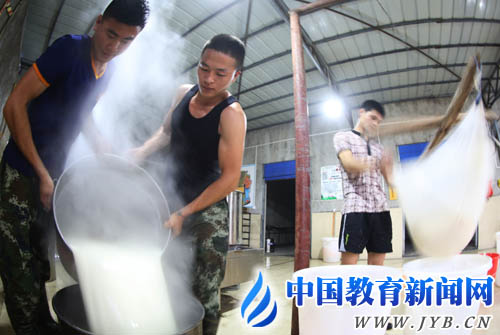 5月20日,孙涛、郭飞、李林超(从左至右)正在豆腐坊紧张工作。俗话说:人生有三苦,撑船、打铁、卖豆腐。然而,就是这卖豆腐的苦差事,却让3名大学毕业生做得有滋有味。李林超和孙涛2012年分别毕业于湖南师范大学、上海大学,毕业后他们各自在社会上打拼了几年。今年,李林超、孙涛连同衡阳财经工业职院毕业生郭飞,在故乡衡阳市石鼓区角山乡开起了荷花豆腐工坊,他们立志要做最健康的“良心豆腐”。>>>详细
