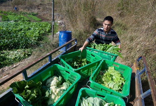 1月16日,刘记虎骑来三轮车,帮助一起创业的大学生“新农人”林则忠运蔬菜。