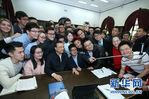 4月15日,中共中央政治局常委、国务院总理李克强到清华大学和北京大学就教育改革发展和实施创新驱动发展战略进行考察。这是李克强在清华大学图书馆与同学们交流并用手机自拍。 新华社记者庞兴雷摄