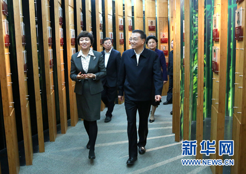4月15日,中共中央政治局常委、国务院总理李克强到清华大学和北京大学就教育改革发展和实施创新驱动发展战略进行考察。这是李克强在清华大学校史馆了解清华百年历程。 新华社记者庞兴雷摄