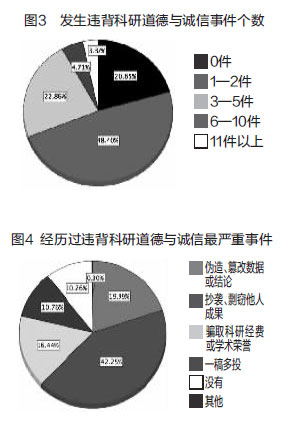 从发生违背科研道德与诚信事件个数上,我们可以发现,79.35%的人身边都有不同程度地发生过违背科研道德与诚信的事件,其中比较多的是1-2件,占比为48.40%。