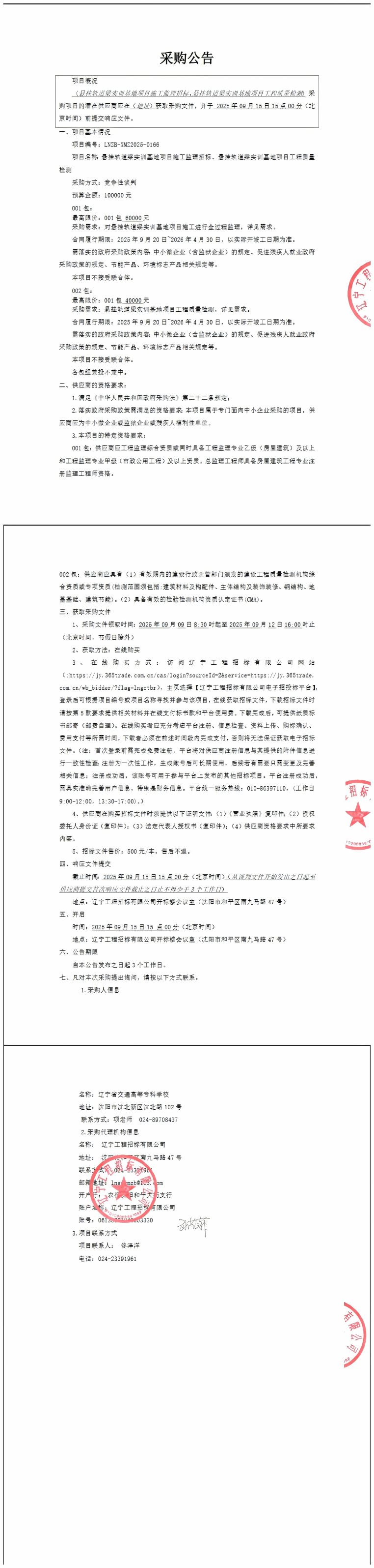 悬挂轨道梁实训基地项目施工监理招标、悬挂轨道梁实训基地项目施工质量检测采购公告