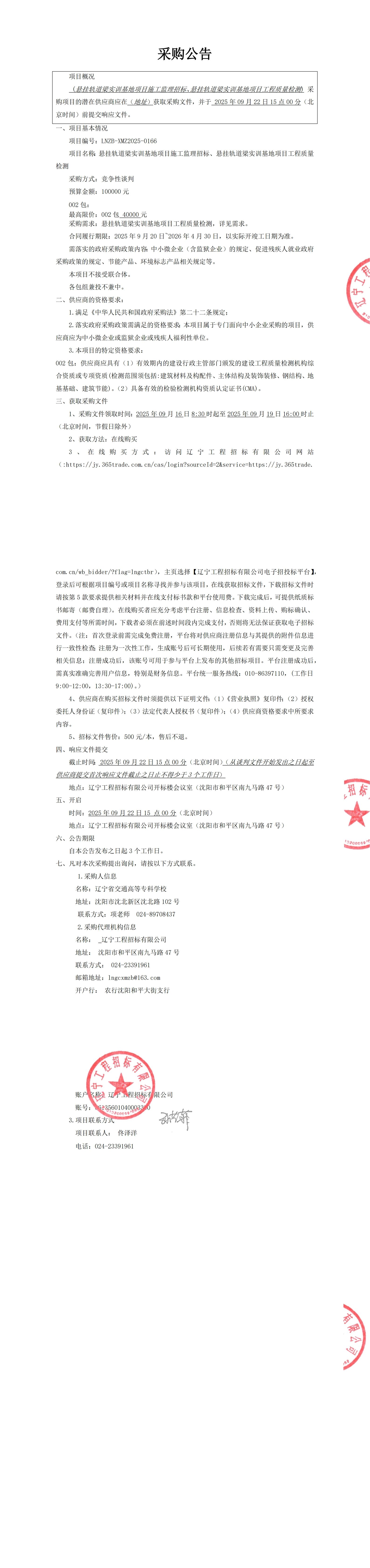 悬挂轨道梁实训基地项目施工监理招标、悬挂轨道梁实训基地项目工程质量检测(三次)竞争性谈判公告