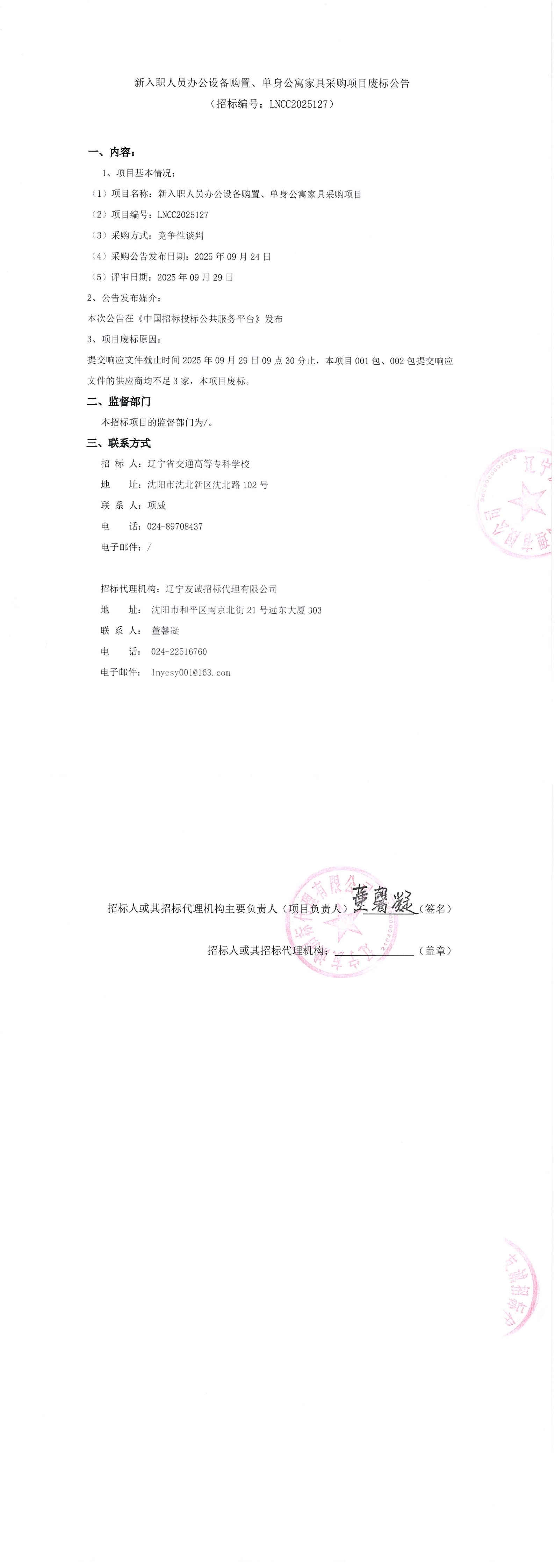 新入职人员办公设备购置、单身公寓家具采购项目废标公告