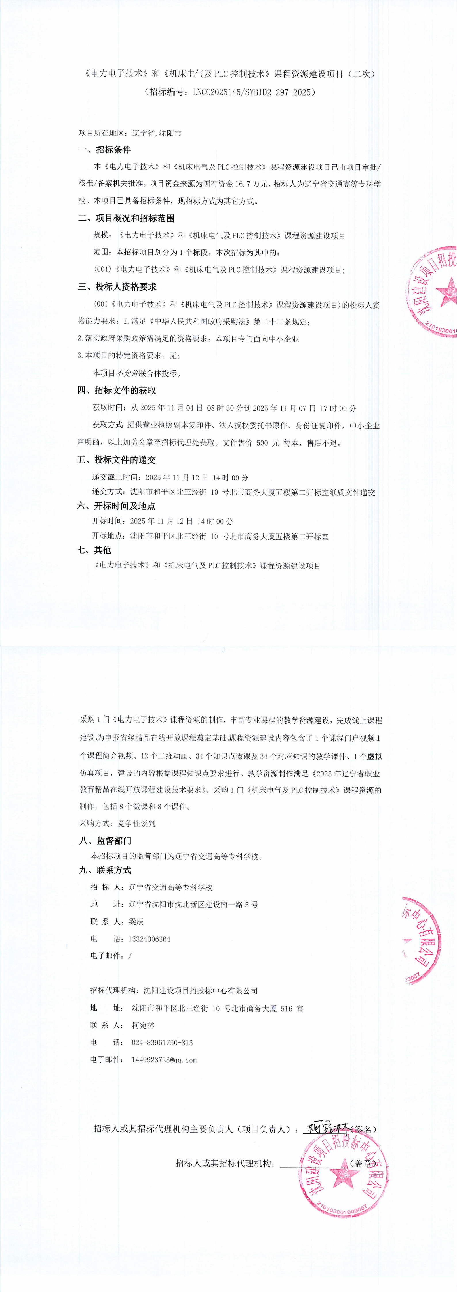 《电力电子技术》和《机床电气及PLC控制技术》课程资源建设项目(四次)采购公告(LNCC2025145)
