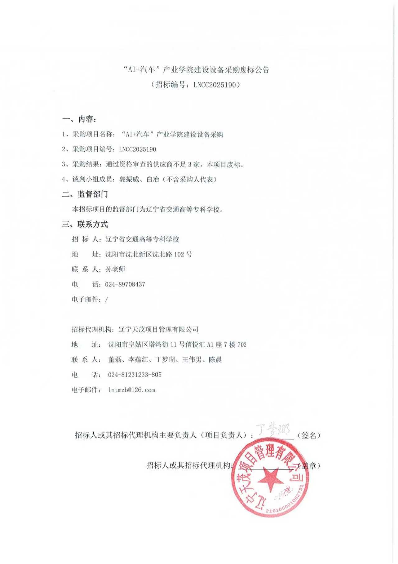 “AI+汽车”产业学院建设设备采购废标公告(LNCC2025190)
